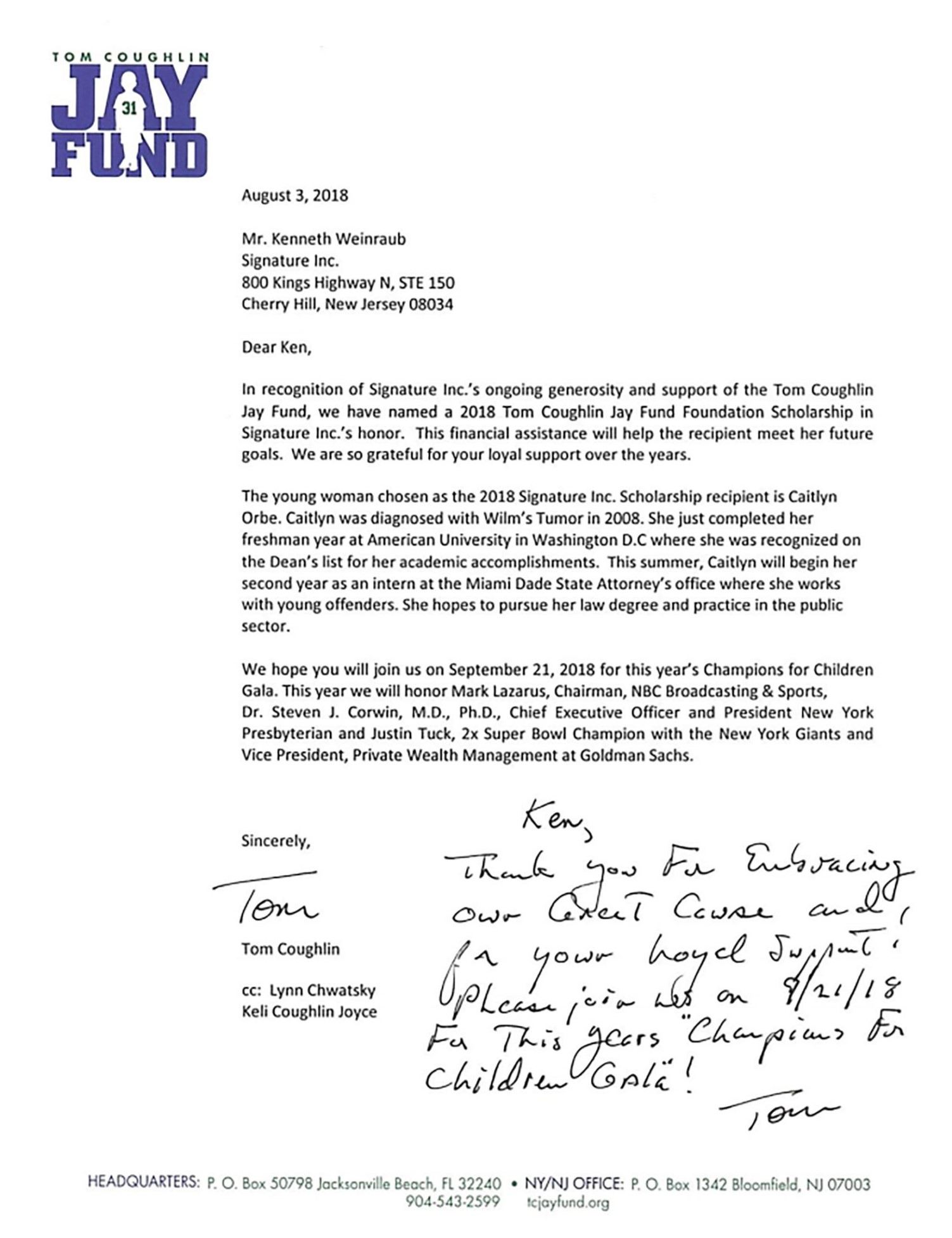 – Lynn Chwatsky, Managing Director- Tom Coughlin Jay Fund Foundation NY/NJ Area