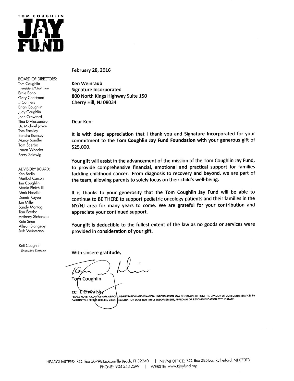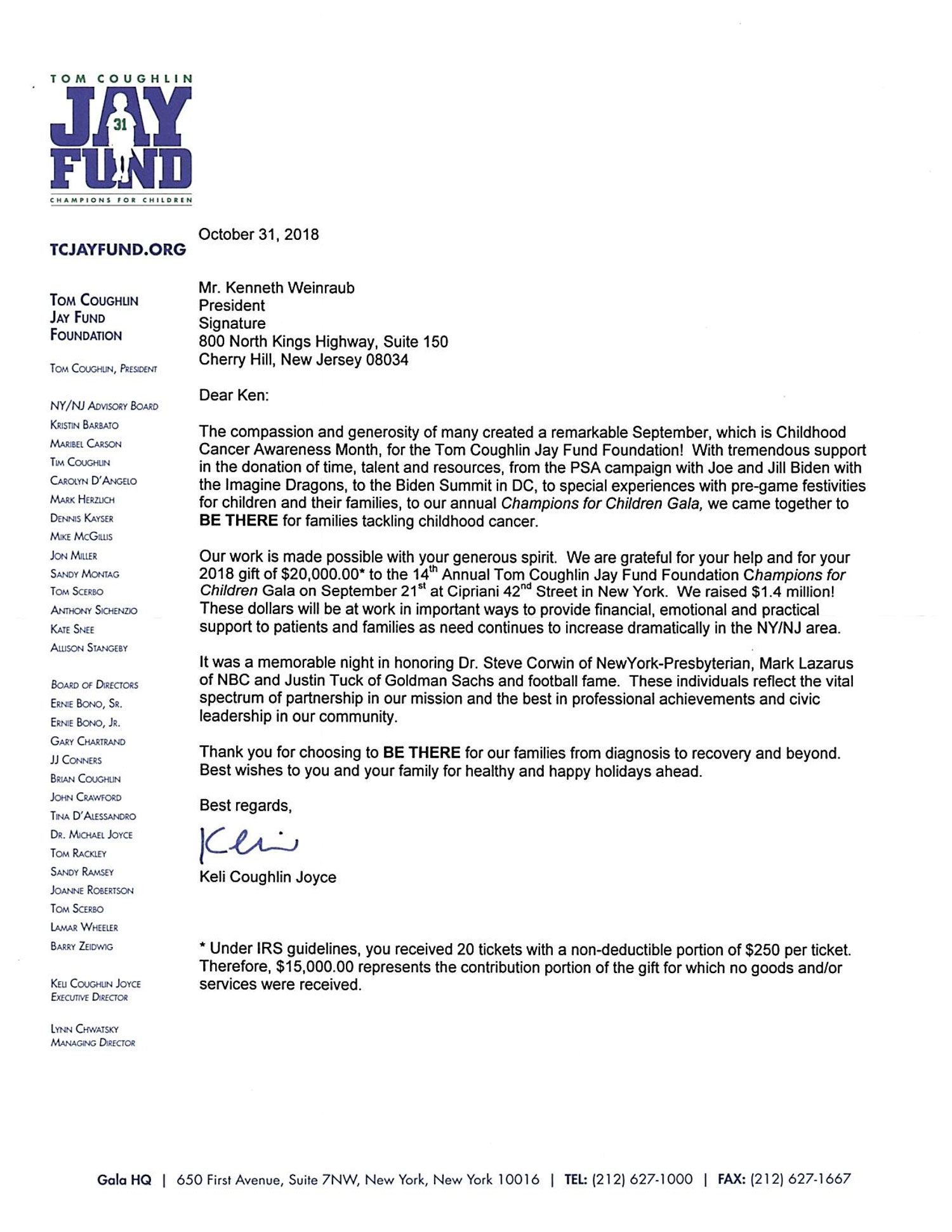 “The Tom Coughlin Jay Fund is grateful for Signature’s support and we look forward to many more years of working together to help families tackling childhood cancer.”